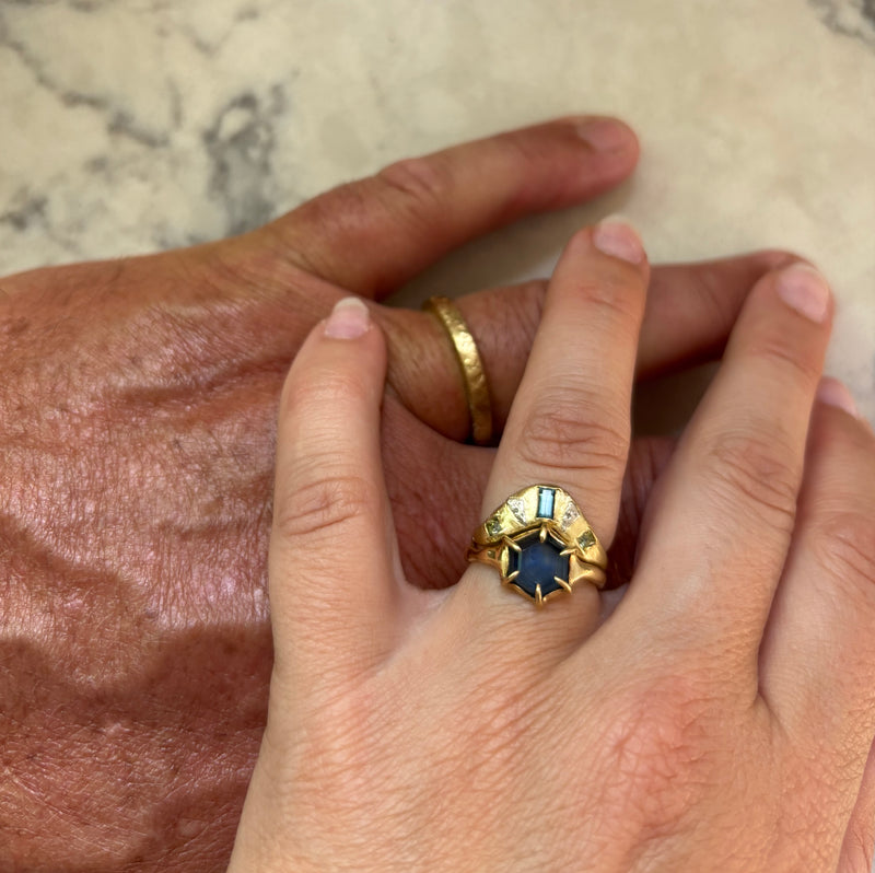 At the core of her practice is a love of reimagining materials—reshaping precious metals, repurposing heirloom stones, and working closely with clients to create deeply personal designs.